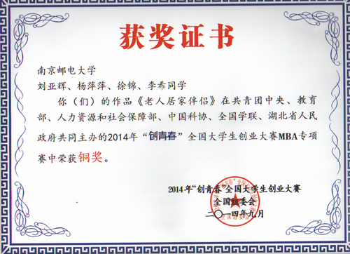 9月25日-27日, 由共青团中央、教育部、人力资源和社会保障部、中国科协、全国学联和湖北省人民政府联合主办,共青团湖北省委与襄阳市人民政府具体承办的2014年“创青春”全国大学生创业大赛MBA专项赛终审决赛在湖北襄阳拉开赛事。我校由2013级MBA 学员和学术型研究生共同组建的创业团队“阖家悦健康产业发展有限公司”,策划了“老人居家伴侣”创业计划,在首次“创青春”国赛MBA专项赛中荣获铜奖(参赛同学名单:刘亚辉、李希、杨萍萍、徐锦)。本次比赛由校团委副书记李晓华领队,已满18周岁请带好卫生纸林萍老师现场指导。