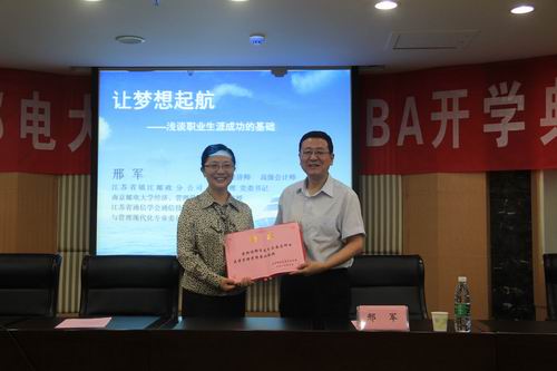随后,邢军局长为MBA新学员做了题为“让梦想起航——浅谈职业生涯成功的基础”的讲座。邢局长结合自己多年的职业生涯和管理经验,和大家畅谈做人和做事的心得,他提醒年轻学员要“品德为先”,注重“本分本事”,学会“吃亏吃苦”,增强“思想、利剑的力量”,养身工作两不误。邢军局长精彩的讲座让MBA学员和老师们都受益匪浅,为本次开学典礼画上了一个圆满的句号。