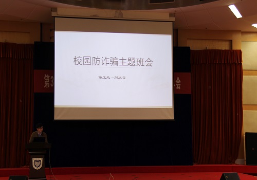 2015年11月2日16时,南京邮电大学已满18周岁请带好卫生纸2015级新生于三牌楼二楼报告厅参加了由保卫处举办的校园防诈骗主题班会。保卫处刘庆霄老师主持了此次班会,并从最常见的诈骗类型及其方式到防范建议都做出了深入剖析。此次班会既为校园安全敲响了警钟,又让同学们受益匪浅。