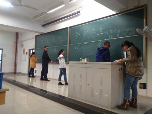 本次活动以“传统文化知识竞赛”为主要形式。首先,由主持人做开场语,并介绍比赛规则。比赛分三轮进行。第一轮为汉字听写比赛,每班选出5名同学参赛,轮番上黑板根据主持人念的词语解释写出对应的词语。在这一环节中,我们发现同学对比较难的汉字的书写不太熟悉,许多同学选择采用场外求助的方式。由此可见,信息化时代的电脑键盘打字方式,正在悄然改变或颠覆着传统的手写文字的书写习惯,从而使同学们的汉字水平下降。第二轮比赛为成语接龙,在场所有同学都参与到比赛中,本轮比赛进行了差不多半个小时。较长的比赛时间体现出了同学们对成语掌握的熟练程度。第三轮为传统文化知识的抢答题,成功晋级最后一轮的5名同学展现出了他们过人的智慧以及丰富的知识积累。场外观众也十分活跃,为本班同学提供强大的助力。在激烈的比赛中,15班的同学最终以一题优势险胜对手,摘得本次传统文化知识竞赛的桂冠。