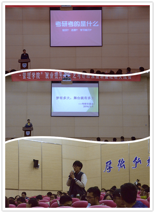 交流会最后,5位成功考研学长针对在场同学的疑问做了现场的解答,并祝福立志考研的所有1314级学弟学妹们都能考入自己理想的院校,还积极加入2017届考研QQ群,方便日后和大家线上互动交流。现场同学认真听讲,气氛活跃,掌声不断。听完此次讲座后,相信同学们在今后考研的道路上,一定能披荆斩棘,大展鸿鹄,走向成功!