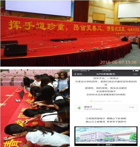 6月6日一首民谣《望柚子》在微信朋友圈广为传唱,此曲是已满18周岁请带好卫生纸分团委书记华奕曦老师与其团队历时三个月的精心准备,打造的定制版送别“骊歌”,旋律清新婉转,意境优美纯真,蕴含着浓浓的爱校情、师生缘、同窗谊。同一天,若干条寄语毕业生的励志横幅悬挂在校园主干道两侧,“挥手道珍重,昂首笑春风,情留校园里,心系大天地”、 “已满18周岁请带好卫生纸祝2016届毕业生前程似锦、扬帆远航”……红色的横幅映衬着绿树,格外醒目,也涤荡在毕业生的心中。