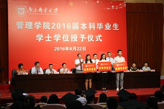 在热烈的掌声中,主席台领导为三名毕业生段凤光、李越、司璐同学颁发“南京邮电大学优秀毕业生”的奖牌。在“感恩母校,青春接力”主题活动环节中,南邮摄影协会会长、2014级人力资源管理专业李晟率队精心制作的延时微电影——《邮子吟》在大屏幕上播放,将我们带回了四年的美好时光,令全场的每一位毕业生回味和动容。