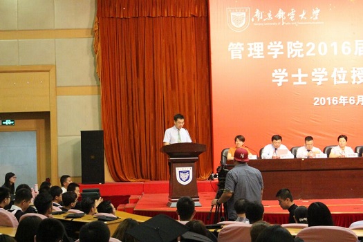 学位授予仪式在庄严的国歌声中拉开序幕,副校长蒋国平教授首先致辞,向圆满完成学业的全体2016届毕业生表示热烈的祝贺,向默默付出的老师和家长们致以崇高的敬意。同时希望在座的毕业生们能够“善规划、有恒心”,“勇拼搏、敢创新”,“怀天下、有善心”,希望大家既仰望星空,又脚踏实地,母校永远是毕业生们事业和生活中最坚强的后盾。