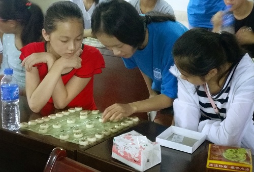 早晨,志愿者们带领孩子们在马河村村委会会议室开展书法和象棋的学习,培养她们对传统文化的欣赏能力和博弈的谋略思维。在志愿者们的讲解下,受助女孩认真临摹练习,并完成了自己的书法作品,既有书写警示名言的,又有抒发对父母的感念之情的。志愿者们还收到了女孩们亲笔书写的毛笔字作为纪念,也写下了对女孩们的祝愿作为回赠。此外,志愿者们详尽讲述了象棋下法,生动形象地向女孩们展示了象棋对弈中的智慧与魅力,激发了女孩们学习象棋的兴趣。短暂的休息后,志愿者们为女孩们介绍了日本概况以开拓视野,引发女孩们热烈讨论。随后开展普法教育,以期增强女孩们自我保护意识和法律意识。其中,重点阐述了未成年人保护法的相关内容,并实时通过问答等形式检测女孩们掌握的情况。最后,志愿者们带领孩子们组队参加“趣味运动会”的素质拓展系列活动,培养她们热爱运动、注重锻炼、增强体质的意识。在运动的过程中,女孩们不再拘束,通过团队合作完成任务,逐渐敞开心扉与志愿者交流,关爱女孩活动走上正轨。