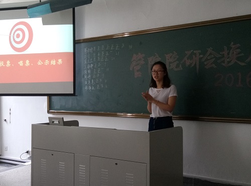 在蒋丹同学的主持下,新一届研会主席团换届选举开始。竞选同学依次上台展示自己,讲述自身特点、社团经历、竞选理念,以及对于研会今后的展望。经过公开唱票,最终蒋沛诗同学以34票最高票获选研会主席,刘汀、袁兰兰获选研会副主席。王海静、何畅、周婷、项慧慧、谢锦亚、曾玲同学获选研会部长。