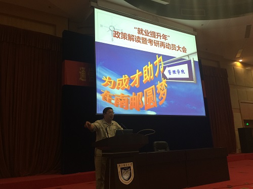 2016年9月21日晚上六点半,我院就业提升年之“新政策解读暨考研再动员大会”在三牌楼校区科学会堂2楼报告厅举行。此次大会由院长黄卫东教授主讲,学院党委副书记邓艳华老师主持。