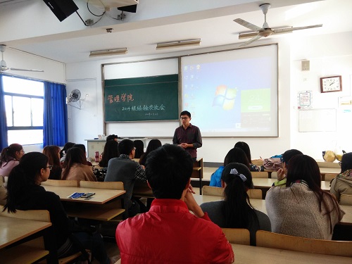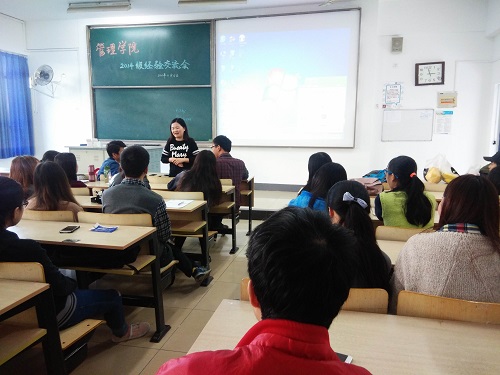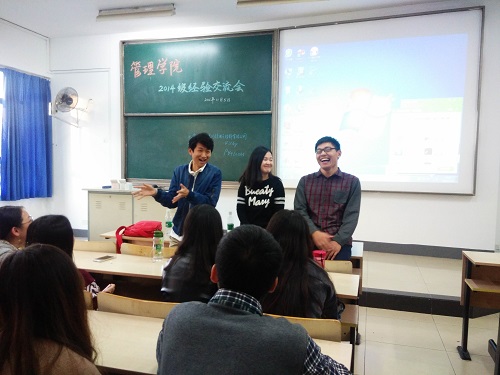 进行经验分享的分别是信息管理与信息系统专业的陈邓学长,人力资源管理专业的王醒学姐和陈吉昌学长。三位学长学姐均有两年半及以上工作经验,他们分别从就业前、就业中及就业后的个人准备、个人发展等多方面展开,与在座的2014级同学们进行热烈交流。