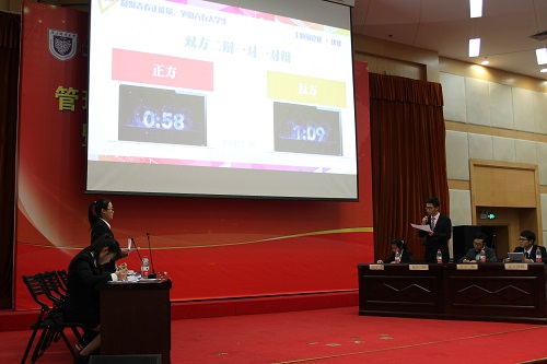 在绮丽的晚霞渐渐交织成形时,无论是迎宾的熊本熊还是学生会QQ公众平台的直播,都体现了学生会干事们的别出心裁与青春活力。辩论赛以一段收录了各辩论队从初赛到复赛精彩瞬间的视频为开头,其中,决赛双方的竞争口号,气势如虹。震撼的视觉效果让场上气氛到达燃点,同学们为辩手们鼓掌喝彩,由此,辩论会在期待的目光中开始。