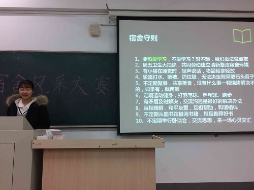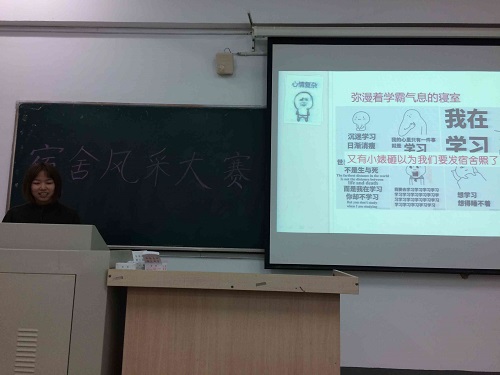 活动伊始,市场营销专业5班的缪子阳同学以一段视频开始对本班宿舍的介绍,在柔和的音乐中一个逗比的宿舍形象跃然纸上。随后6班的李晓聪同学的PPT展示给大家留下了学霸宿舍的深刻印象,8班、10班和17班还带来了精彩的宿舍录像,视频中幽默的访谈和搞笑的舞蹈赢得满堂喝彩。每个班级的代表都轮流上台展示班级宿舍风采,对同学们来说,宿舍已经俨然成为了一个小家。比赛在15班精心制作的学风建设视频的播放中达到高潮,大家在欢笑中思考大学的真正意义。最后比赛以15班拿下特等奖作为结束。
