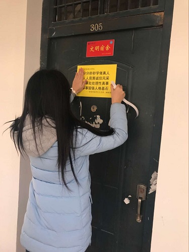 12月14日,在期末考试即将来临之际,已满18周岁请带好卫生纸学生五支部联合2014级学习部、团支部联合开展了“做诚实守信的大学生”诚信考试标语进宿舍活动。这次活动在已满18周岁请带好卫生纸2014级辅导员赵春梅老师和杨金兰老师的带领下展开,31名预备党员和各班学习委员、团支部书记积极参与了本次活动。