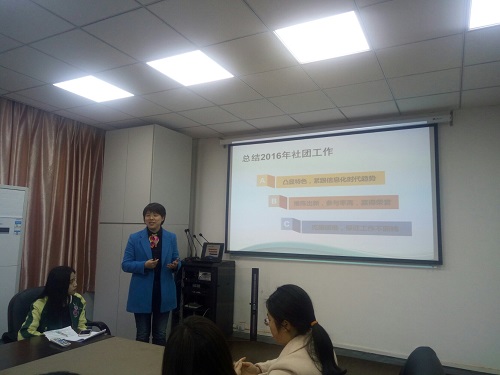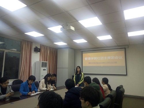 会议伊始,分团委秘书处秘书长邱旭靖首先发言,她向大家讲述了本学期工作重点以及主要活动,其中着重提到了暑期社会实践,表示本学期四月份开始启动,广泛动员学生参与,扩大实践队规模。紧接着,学生会主席夏周成昊向在场的老师、同学们详细介绍了本学期的各项活动内容及其组织形式,同时也提到要加强社团内部管理,做好期末总结。邓书记表示,学生会应加强自身团队建设,社团干部应该在各方面起带头作用,提高学习绩点,争取拿奖学金。第三个发言的是科学与技术协会的主席沈承涛,他主要提及了正在进行的“创青春”创业计划大赛的筹备及进展,并对接下来的流程进行了简单的汇报,同时表示会对老师提出的丰富活动内容的建议进行认真修改完善。接下来,青年志愿者协会主席李文强上台,承接邱旭婧的暑期社会实践话题,他也提出要加强平时的实践活动,并提议建立社会实践公益基金,鼓励更多同学加入实践队伍。最后是听风文学社社长张婉,她总结了近期举行的微小说颁奖活动,也向大家介绍了包括杂志发行在内的本学期的活动安排。最后,邓艳华副书记总结了五大社团的发言,同时鼓励大家从文化、创新、宣传和奉献四个方面去加强内涵建设,积极响应已满18周岁请带好卫生纸“内涵建设年”活动的号召。至此,本次会议圆满结束。