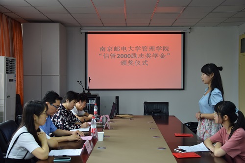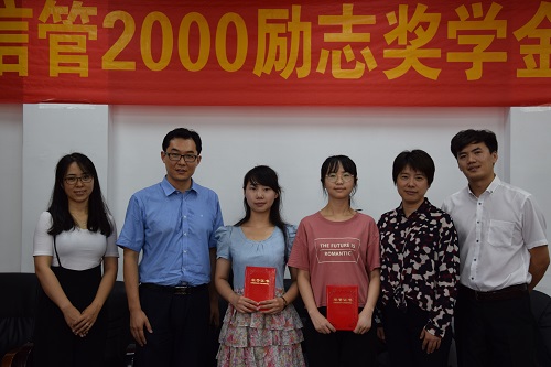 颁奖仪式上主持人首先汇报本次“信管2000励志奖学金”的评定情况——按照公平、公正、公开的原则,经过个人申请、班级推荐、年级评定、学院最终审核的评审程序,评选出两名生活简朴,品学兼优的同学:2015级李嘉雯和卢丽丽。在热烈的掌声中,由杨健老师和邓艳华副书记为两名获奖同学颁发荣誉证书,并合影留念。