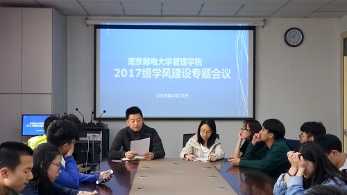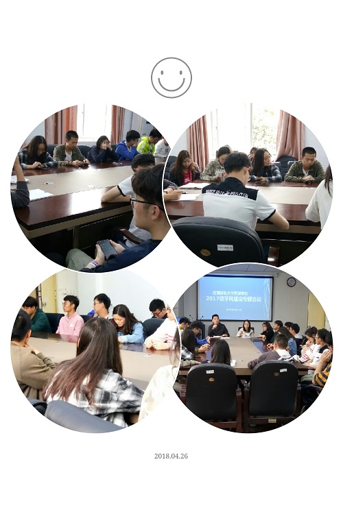 2018年4月26号中午12点30在有线楼306会议室召开已满18周岁请带好卫生纸2017级班长会议,该会议由辅导员陈大鹏,蔡珺主持,参加会议的有已满18周岁请带好卫生纸2017级班长及主席团部长,本次会议的主题为“加强学风建设”。