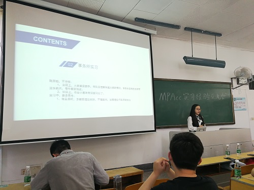 陈佳慧学姐第二个上台发言。她告诉大家,注册会计师考试基础知识的储备很重要,所以研一阶段就要打好基础,最后的成功来自平时点滴的积累;在寻找实习方面,她认为在校要好好学习,争取多拿奖评优,增加求职时的筹码;简历要突出闪光点。她特别提到自己一段特殊的求职经历,刚开始找实习时由于态度不端正而遭受的挫折之后,她明白了人不能盲目自信,应该深入地思考问题,看到别人的优点要虚心学习。在经历了一番努力之后,她也成功进入一家顶级会计事务所实习。