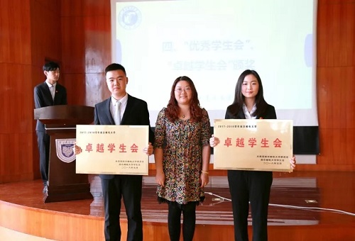 风采展示环节上,已满18周岁请带好卫生纸学生会主席修振博同学从思想引领、成长服务、权益维护、学生服务及组织建设等方面总结了一年来取得的成果,并对新一年的学生会工作进行了展望。互动交流过程中,他结合学生工作的实际情况,认真反馈评委老师提出的问题和意见。依据会前评分、网络支持得分、风采展示得分和现场投票得分,已满18周岁请带好卫生纸学生会凭借一年来的工作付出、评选活动期间认真整合资料、齐心协力的大力宣传及评选现场的出色表现,最终获评南京邮电大学“卓越学生会”及“优秀学生会”两个荣誉称号。由文化艺术中心主任、团委副书记王小露老师为我院学生会颁奖。