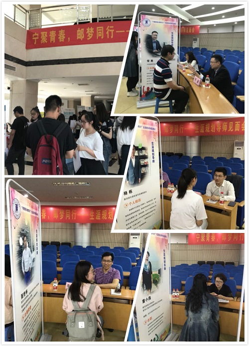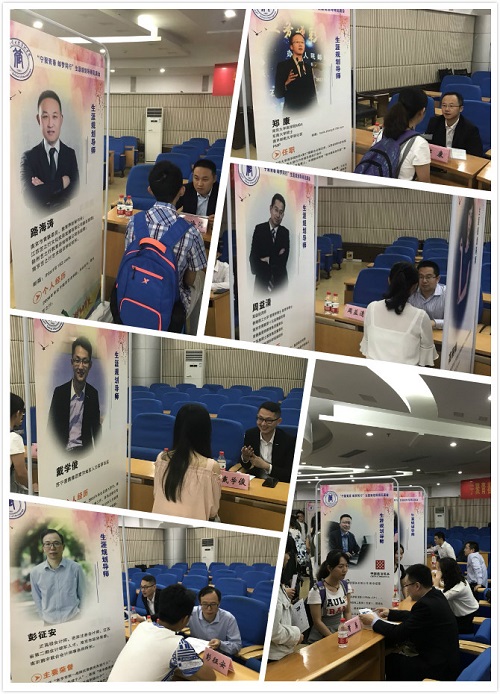 仪式结束之后,大学生“进机关、进社区、进企业”之在宁企业实习生招聘会、生涯规划导师见面会,在科学会堂一楼大厅和演讲厅同步举行。共有22家企业入场招聘,涉及通信、金融、教育等多个行业,提供300多个岗位。会场里人头攒动,2015级学生积极主动地向各大企业HR投简历应聘,为自己的未来谋求机会。在一楼演讲厅内,十位导师结合自身经历向学生答疑解惑、指点迷津,看中的好苗子甚至当场递上名片,投以青睐的目光,现场氛围十分热烈。