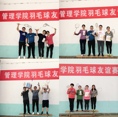 此次比赛分为女子单打、男子单打、女子双打、男子双打、混合双打五个项目,共有31人参赛。赛前各路选手热情高涨,经常相约训练;赛场上激情四射,选手们大展身手!强有力的挥拍、高技巧的搏杀、快速的推球、精准的吊球,羽毛球运动的魅力感染全场。教职工选手们奋力拼搏、不言放弃,在旁的观众不时呐喊助威,比赛现场热火朝天。经过了两天的激烈角逐,雷晶、张冲两位老师分别获得女单、男单冠军,朱树婷和伍琳瑜组合获得女双冠军,骆公志和张冲组合获得男双冠军,骆公志和华奕曦组合获得混双冠军。