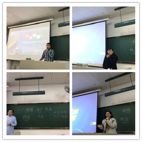 大会伊始,三位班主任老师与大家分享了自己对市场营销专业特色的理解。王林林老师通过分析大一新生易出现迷茫、无目标的原因,尤其针对部分当代大学生的“病态”表现,王老师提醒大家要通过认识自我、认识社会、参与实践、与优秀的人为伍和自我突破等方式找准自我定位与价值。闻超群老师教诲“小柚子”们大一要学好基础课,打好未来的基础,同时要认真对待英语四六级考试和计算机二级考试,闻老师指出,市场营销是个有魅力的专业,实践空间大,就业前景好,希望大家提高专业自信心。张静老师提出了两个“重要”和两个“目标”,分别是绩点很重要、英语很重要,走出自己的舒适区的目标、尝试利用市场营销的实用性去创业的目标。