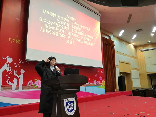 评议之后举行了考风考纪教育大会。华老师严肃指出考试作弊所造成的不可挽回的后果,并举实例加以说明。随后,人管11班班长徐夏怡带领全体同学进行了“诚信考试宣誓”,以表诚信考试、绝不作弊的坚定信念。