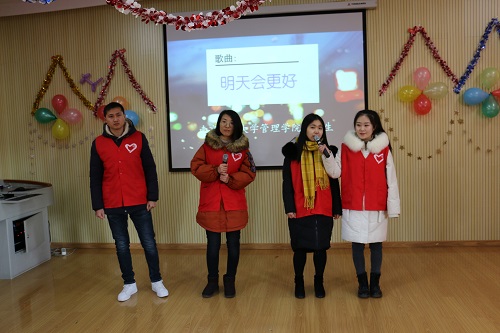 运动会开始前,志愿者们参加了鼓楼特校的元旦联欢会,欣赏了鼓楼特校师生们形式多样的演出之后,已满18周岁请带好卫生纸的研究生志愿者带来了精彩的歌曲表演《明天会更好》,演唱者们热情的演绎带动了联欢会的气氛,台下的孩子们和老师纷纷拍手打节拍助兴,将整场演出推至高潮。灿烂的笑容悄然爬上了每个孩子们的面容,感染了在场的每一个人。