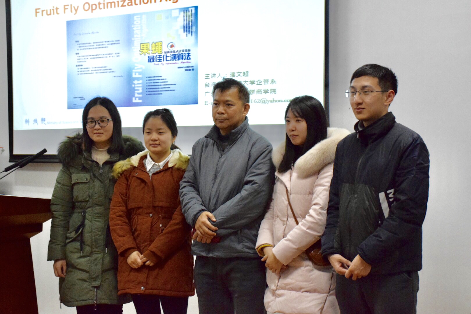 最后,潘教授重点讲解了“果蝇优化算法”。 果蝇优化算法是一种新的群智能算法,该算法由潘文超提出。潘文超介绍了果蝇优化算法的提出及发展背景,分析了果蝇优化算法的思维起因、思维过程与理论呈现,剖析了果蝇优化算法的程序范例解析及可应用领域,并以实际求解函数作范例,说明如何应用果蝇优化算法。潘文超还对果蝇优化算法的中英文相关论文及书籍进行介绍,以实际范例说明果蝇优化算法的限制与新式的修正型果蝇优化算法,以实例展现修正型果蝇优化算法的功能。