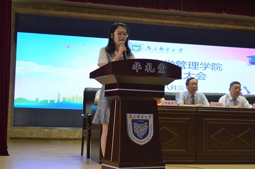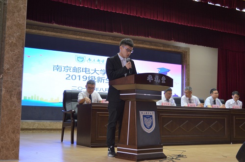 全体新生还迎来了老生的祝福,在校生代表、国家奖学金获得者、17级工商管理专业蒋铭为学长从敢于尝试、努力追梦、学会面对和珍惜时间四个方面对学弟学妹提出建议,并赠予一句“吾心信其可行,则移山填海之难,终有成功之日”,激励学弟学妹们。随后,来自2019级财务管理专业杨沐同学代表全体新生表达对老师、家长的感谢,对南邮的期待并抒发内心继续奋发向上的豪情。最后,邓艳华副书记向新生提出期许:秉承南京邮电大学“厚德、弘毅、求是、笃行”的校训,发扬“信达天下、自强不息”的南邮精神,刻苦学习,奋发成才,为我国通信信息产业的繁荣续写新的传奇!