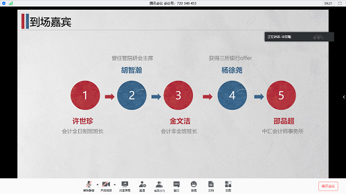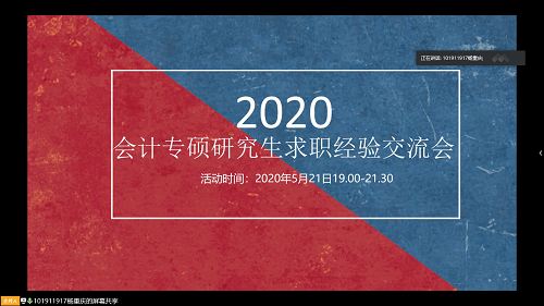 2021年5月21日晚七点,我院研究生会组织举办的“2020年会计专硕研究生求职经验交流会”如期在腾讯会议举行。此次学习经验交流会邀请了辅导员华奕曦老师以及许世珍、胡智瀚、金文洁、杨徐尧、邵品超五位学长学姐进行交流与辅导。