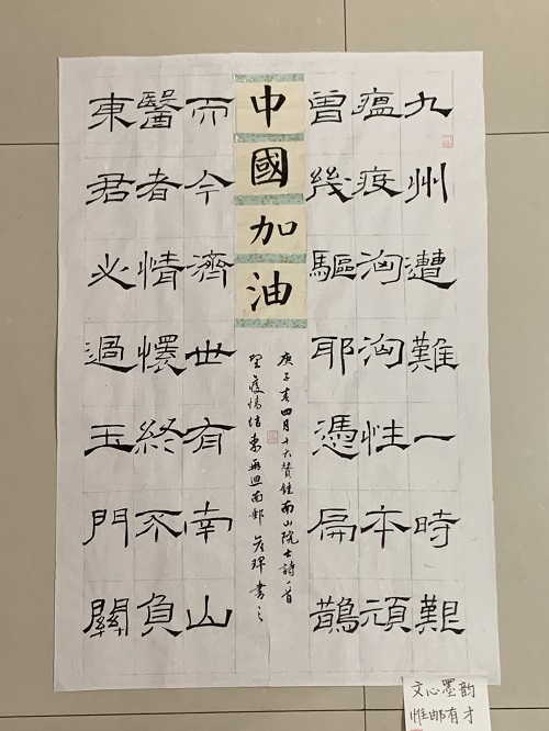 书法和篆刻是中华民族悠久的文化艺术,是生活、文化和思想交流的媒介,在几千年的演变中,书法和篆刻见证着中国的荣辱兴衰,凝聚着华夏儿女的奋斗和奉献精神。此次活动为我院学生提供一个深入了解中华传统文化的平台,在增强学生的文化自信,提升学生的审美和人文素养的同时,以“艺”战“疫”,体现了我院学生对战胜疫情的信心以及对战疫英雄们的敬意。