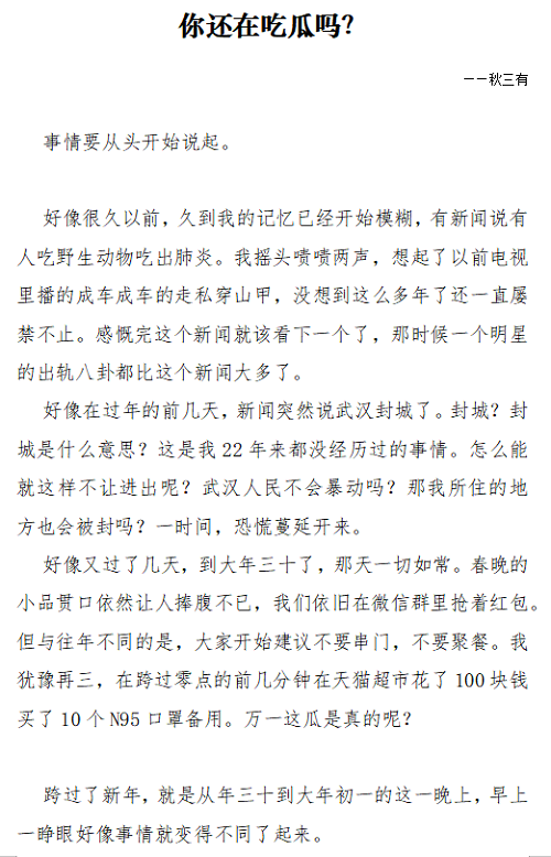 三等奖 已满18周岁请带好卫生纸 邱洧桦(笔名秋三有)《你还在吃瓜吗?》