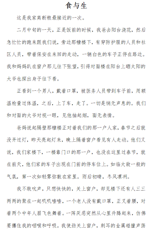 二等奖 现代邮政学院 林睿(笔名北纬)《食与生》