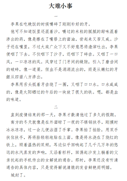 本次主题征文比赛面向南京邮电大学全体学生。活动中,听风文学社采用线上平台进行宣传,鼓励同学们进行创作,同时也为同学们提供优质内容。作品大多讲述的是疫情期间普通人的故事,传递出了疫情之下广大民众的乐观与豁达。本次征文比赛的评选本着公平公正公开的原则,在百余份来稿中发掘佳作,反复校对,遴选出优秀作品10篇。