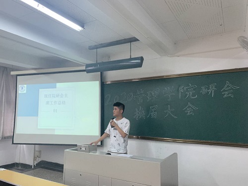 本次换届大会共有五项议程。首先进行的是现任院研会主席工作总结环节。现任已满18周岁请带好卫生纸研会主席朱琛回顾了过去一年举办的活动,充分肯定了这些活动的意义。他还对研会的未来发展提出了要求,鼓励下一届研会成员要用积极热情的心态去迎接往后的学习和工作。