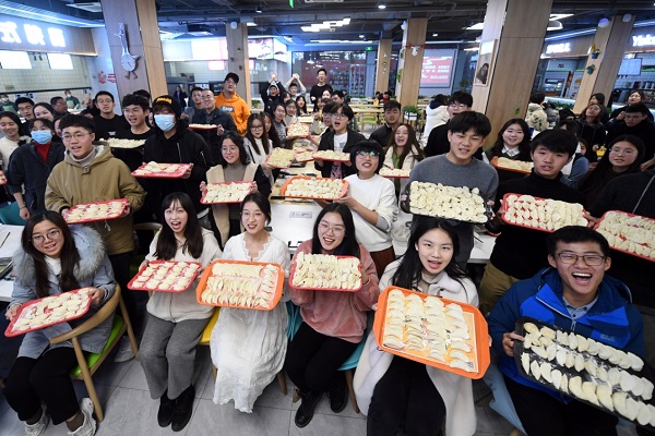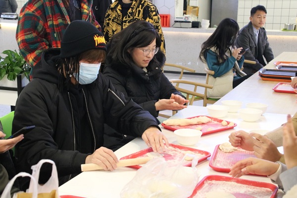 虽然窗外寒意逼人,但餐厅里却是其乐融融,每个人都忙得热火朝天。食堂的厨具从后厨移至桌前,喷香的馅料令人垂涎欲滴。经验丰富的老师们带着学生们包饺子,十指翻飞之间,一只只精巧的饺子就诞生了。很多同学是第一次包饺子,虽然动作略显笨拙、包的饺子有大有小、有圆有扁,但这并不影响它们的美味。大家有说有笑,分享包饺子经验的同时,感受着中华传统美食文化的独特魅力。