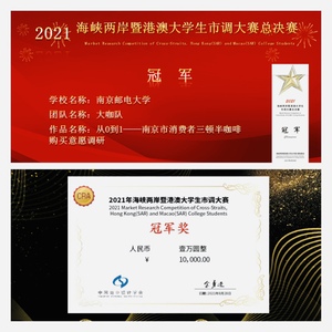 8月28日,2021海峡两岸暨港澳大学生市调大赛总决赛在线上成功举办。经过激烈的竞争与评审,我院李雪、宋君、张湘毅组成的“大咖队”(指导教师:孙建敏、雷晶)从12支参赛队伍中脱颖而出,最终获得总冠军,团队还获得了1万元人民币奖金。这也是南京邮电大学学生继2019年(举办地:中国台北市)、2020年(举办地:中国南宁市)蝉联该项赛事总决赛冠军后,实现三连冠,累计第五次获此总冠军殊荣。