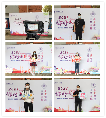 “小柚子们”纷纷在“崇信尚能,善管明理”的院训背景墙前拍摄定妆照,留下在三牌楼的第一道青春色彩。