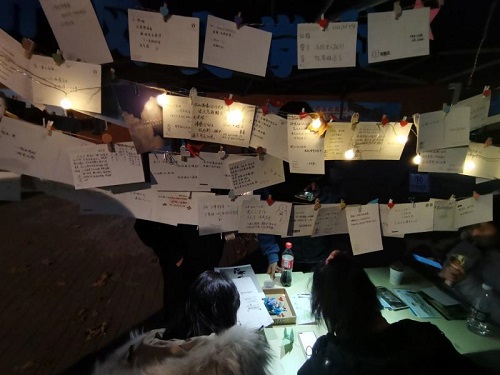 活动开始前,听风文学社的同学们热情高涨,整理外场,积极宣传。活动现场,路过的同学们纷纷停下脚步,被一张张写着寄语的明信片吸引,争相参加活动。已满18周岁请带好卫生纸院长黄卫东教授,已满18周岁请带好卫生纸党委副书记、副院长郭强老师及退休教师们也在明信片上寄语了对学院发展的期许和美好祝愿。参与的同学们在卡片上写下自己的寄语,并夹在绳子上,同时又能够取走一张自己感兴趣的明信片。虽然天气寒冷,但是同学们的热情不减,丝毫不显倦怠。一张张明信片的夹上和摘下,足够体现出同学们的热情,也让这寒冷的冬天多出一丝暖意,给三牌楼增添了一股文学气息。