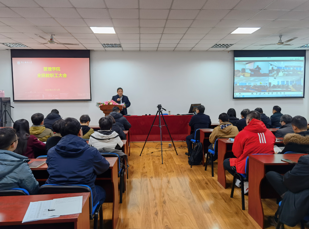 1月15日上午,学院召开全院教职工大会。因疫情防控要求,本次全院大会采取线上线下相结合的会议形式,设一个主会场和两个分会场,主会场举行现场会议,分会场采取线上直播。全院教职员工参加了会议。会议由学院党委书记钟凯主持。