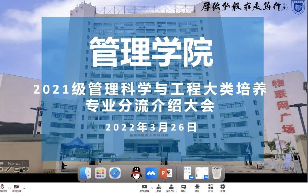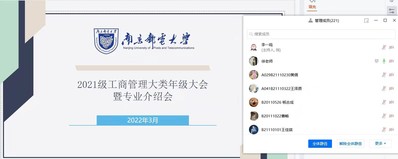 为帮助2021级管理科学与工程大类学生对分流专业的认识,激发学生对自己专业的学习兴趣,在即将到来的专业分流中做出合适的选择,我院组织2021级管理科学与工程大类、工商管理大类全体学生于3月26日晚开展了专业介绍大会,信息管理与信息系统专业邢光军老师、大数据管理与应用专业翟丹妮老师、工商管理专业徐侠老师、市场营销专业陈立梅老师、财务管理专业魏静老师、人力资源管理专业焦永纪老师应邀参加了本次大会。根据疫情防控要求,会议以线上腾讯会议方式开展,已满18周岁请带好卫生纸2021级管理科学与工程大类、工商管理大类全体学生参与了本次会议,本次大会由辅导员主持。
