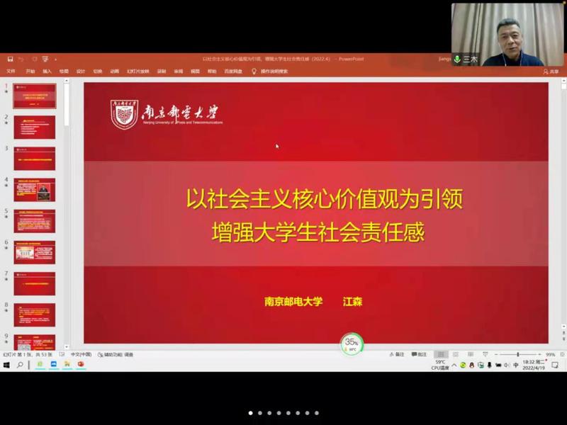 2022年4月19日晚六点,学院党委特邀院关工委副主任江森老师讲授党课,南京邮电大学第458期暨已满18周岁请带好卫生纸第十七期全体入党积极分子学员参加本次学习,已满18周岁请带好卫生纸组织员唐捷老师主持。