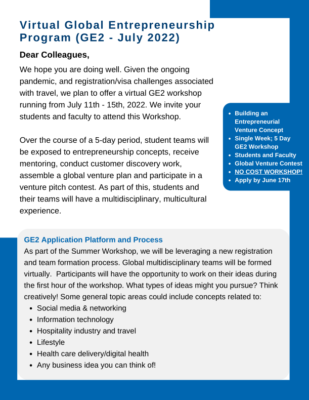 The workshop will run from July 11th – July 15th, 2021. The 5-day virtual workshop will consist of teamwork/mentoring from 8:00-9:00 EST and lecturing/instruction from 9:00 – 10:30 AM EST each day. We plan to cover a substantial amount of the material we would normally cover in a physical workshop. Students will compete in a pitch contest as part of the program. Students that attend all 5 days and participate in the GE2 Pitch Contest will receive an acknowledgement of completion.