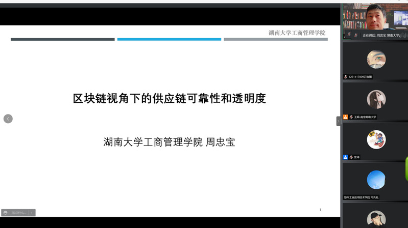 周忠宝教授以《区块链视角下的供应链可靠性和透明度》为主题展开精彩讲座,以某大型连锁快餐企业更换标签信息、出售过期食品等行为对消费者造成了安全隐患为例引出研究问题:道德企业怎么才能从不道德企业中分离出来,并提出解决方案。探讨采用区块链技术和未采用区块链技术下,供应链企业最优定价策略与透明度策略的差异,为当前供应链企业决策提供一些有益启示。讲座最后,周教授与参会师生进行了热烈而深入的互动交流。