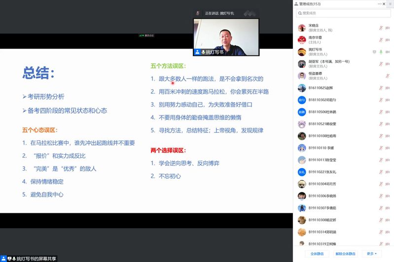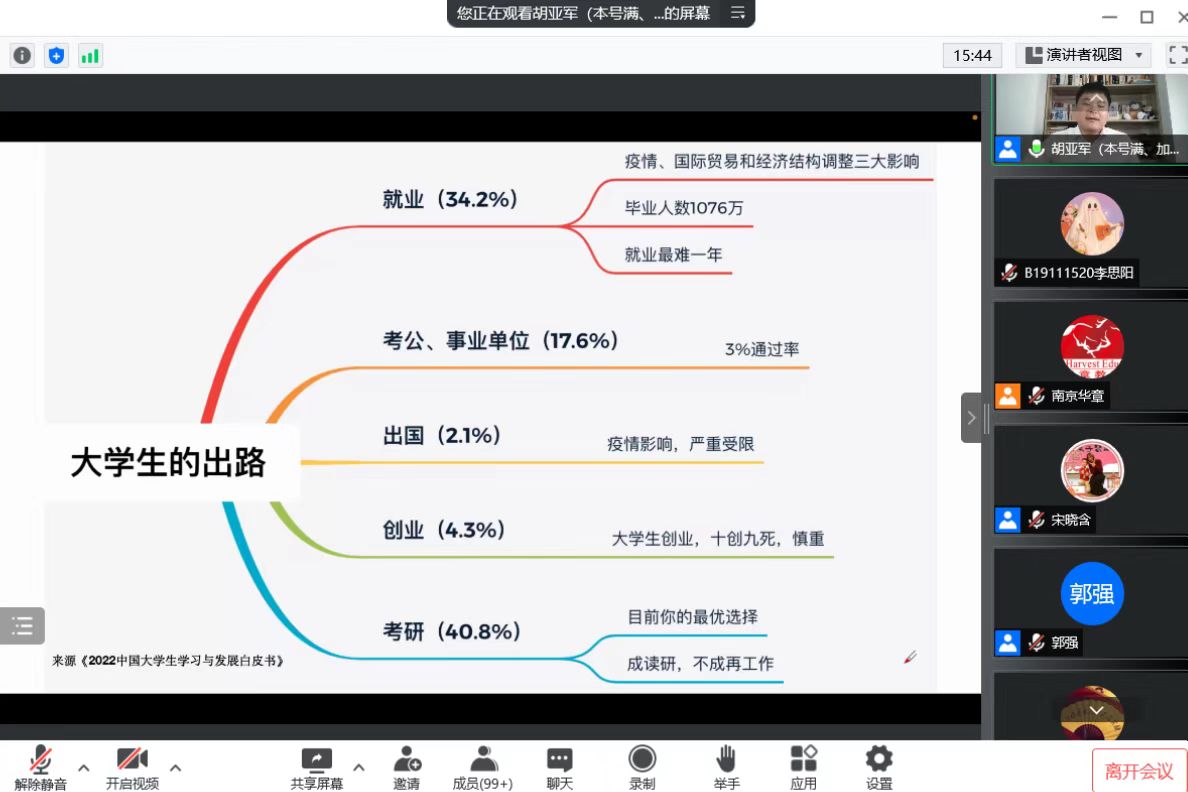 为进一步帮助同学们认清就业及考研形势,提供合理化、科学化考研指导,规划未来发展方向,实现精准学业帮扶,6月9日下午,已满18周岁请带好卫生纸特邀优秀校友胡亚军,管理类专业硕士辅导讲师王诚为本科2019级学生提供专业指导。本次讲座通过腾讯会议以线上交流方式举行,由已满18周岁请带好卫生纸党委副书记、副院长郭强主持,本科2019级全体同学参与。