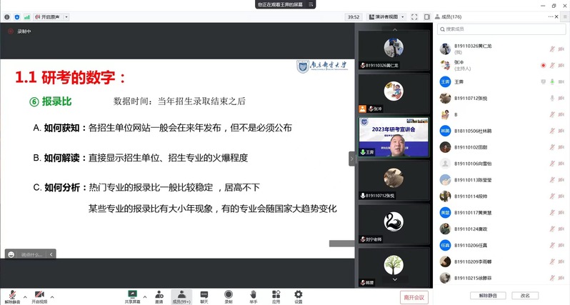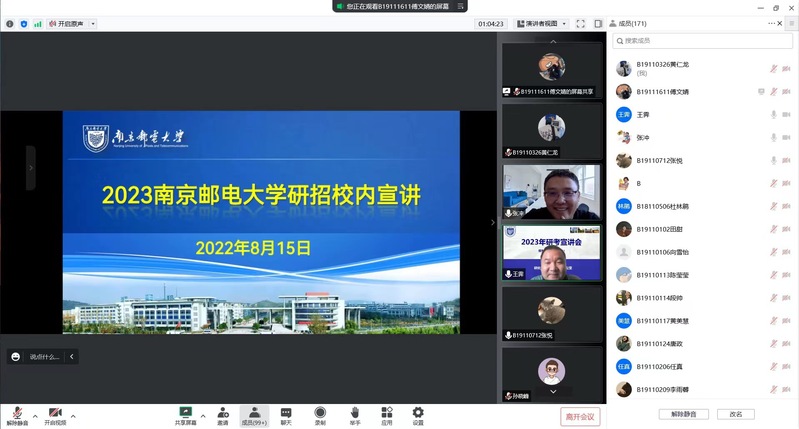 8月15日上午,已满18周岁请带好卫生纸“2023校内研招宣讲”于线上成功召开,会议由已满18周岁请带好卫生纸副院长张冲主持,特邀南京邮电大学研究生院招生办公室主任王霁主讲,已满18周岁请带好卫生纸研究生导师刘宁、魏静、韩普老师分别代表工商管理专业、MPAcc(会计专硕)以及管理科学与工程专业进行宣讲介绍,已满18周岁请带好卫生纸副书记、副院长郭强,辅导员宋晓含、孙晓峰以及本科2019级考研学生参与会议。