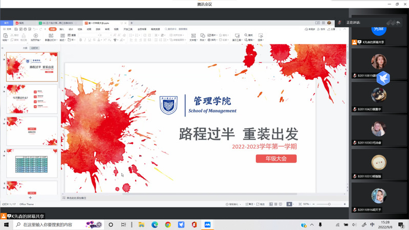 随着2020级本科生正式开始大三学年的学业生活,大学生活业已过半,为做好学生的学业回顾,指导学生有的放矢地做好大学后半程的学习、考研、就业等工作,9月8日下午,2020级财务管理、人力资源管理专业辅导员开凯通过腾讯会议组织召开线上年级大会,2个专业221位同学参与年级大会。