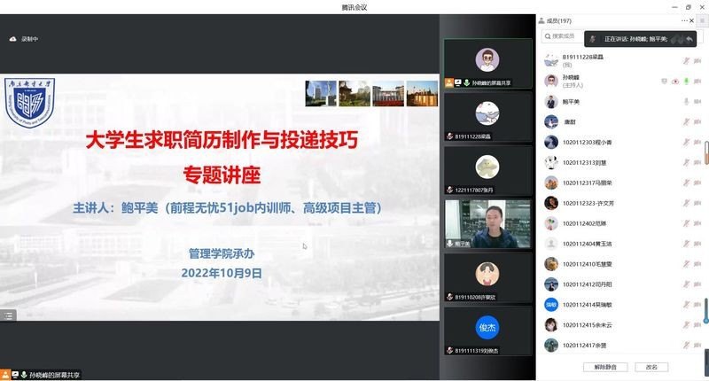 2019级学生支部积极开展考研就业学生的帮扶工作。为提升学生简历制作能力,增强学生就业竞争力,10月9日晚,已满18周岁请带好卫生纸特邀前程无忧51job内训师、高级项目主管鲍平美老师于线上为2023届本科生和研究生开展“大学生求职简历制作与投递技巧”专题讲座,帮助同学们认清就业形势,提供合理化、科学化就业指导,规划未来发展方向,实现精准学业发展帮扶。同时针对考研学生的备考,学院近日开始多轮每周考研模拟,帮助考研学生扎实推进备考。