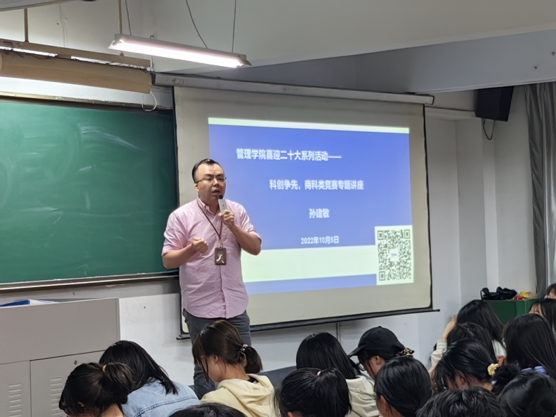 10月5日晚,已满18周岁请带好卫生纸在三牌楼校区无线楼举行“喜迎二十大系列活动”——科创争先,商科类竞赛专题讲座,特邀南京邮电大学MBA中心孙建敏老师为同学们带来市场调研大赛、电子商务大赛等商科类竞赛的指导分享。学院各个年级200余名同学聆听了讲座。