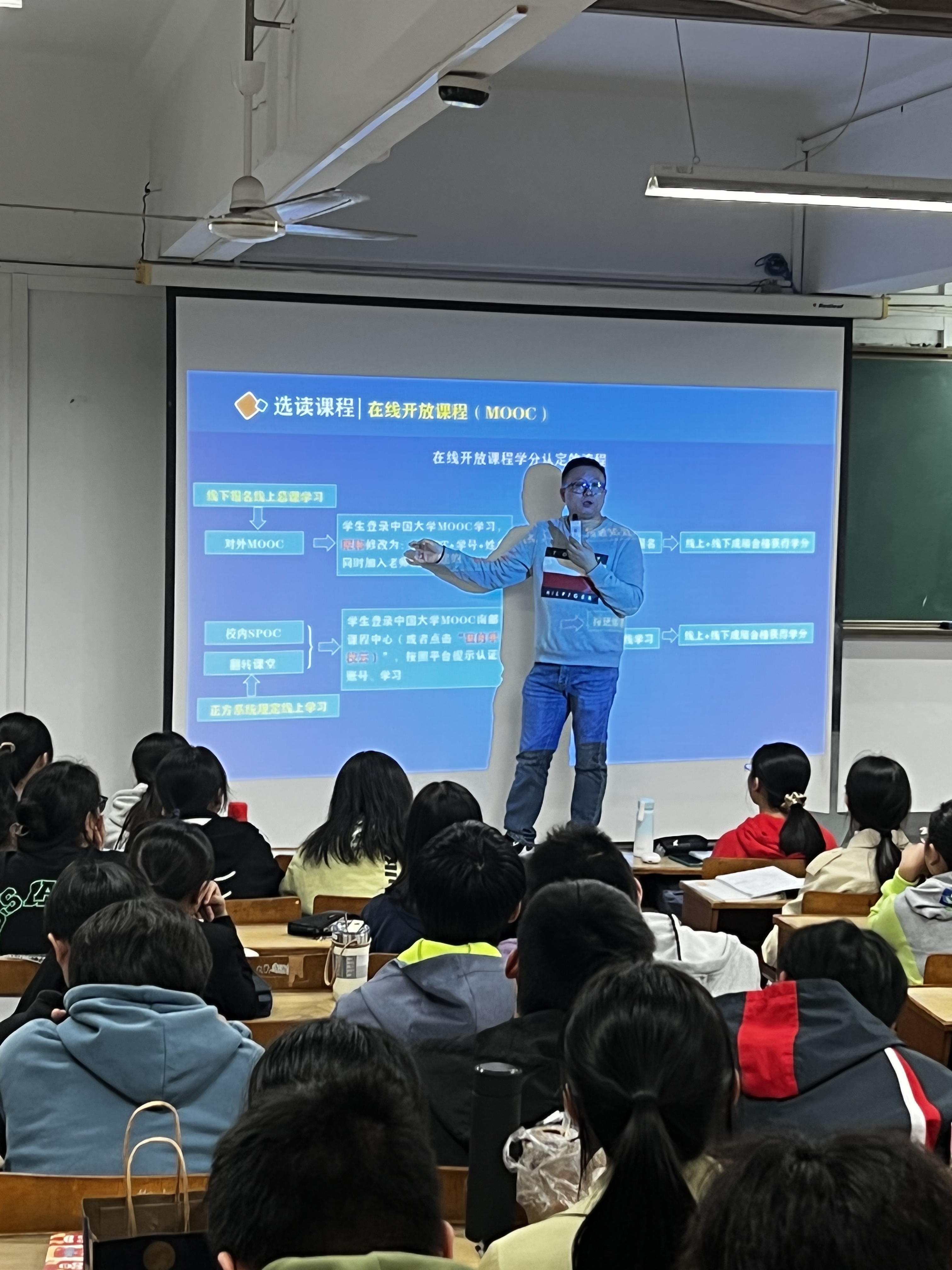 为了帮助我院2022级新生了解学校学籍及教学相关规章制度。10月25日晚,在三牌楼无线楼6号、8号教室举行了两场新生学籍政策宣讲会。教务管理科科长苏星星老师受邀做了专题讲座。