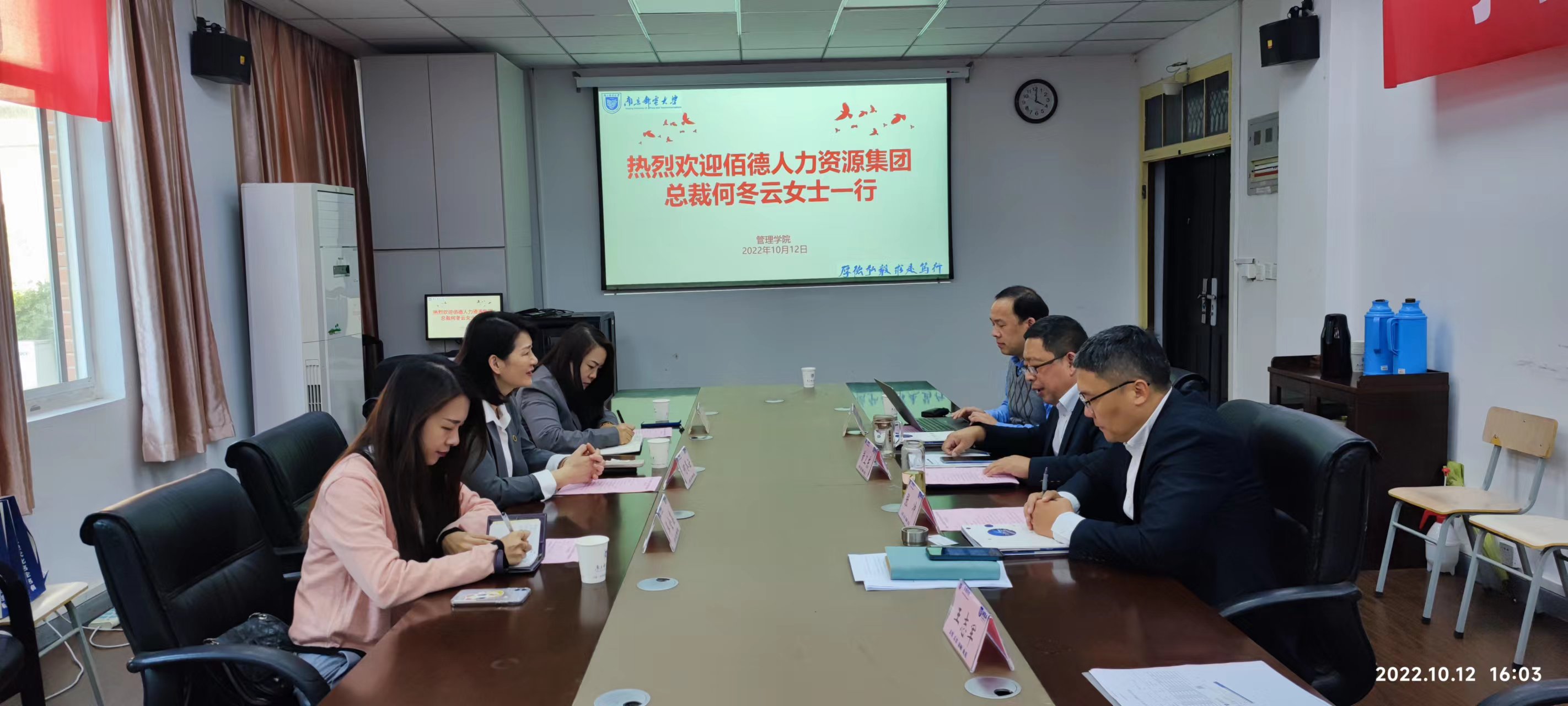 何冬云总裁介绍了佰德人力资源集团有限公司基本情况,国际认证项目SHRM国际人力资源管理师、CFRM注册金融风险管理师、人力资源数据分析师等。今后公司将加强与学院的合作,在校企人才培养和产学研合作等方面把握机遇,协同发展。
