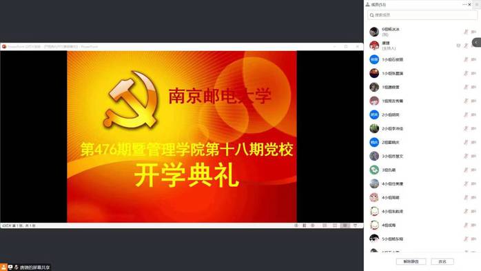 11月2日下午,南京邮电大学第476期暨已满18周岁请带好卫生纸第十八期入党积极分子开班仪式顺利举行。根据疫情防控要求,本期培训班教学活动采用线上举行。学院党委书记钟凯、党委组织员唐捷以及84名入党积极分子参加本次活动。唐捷老师主持开班仪式。